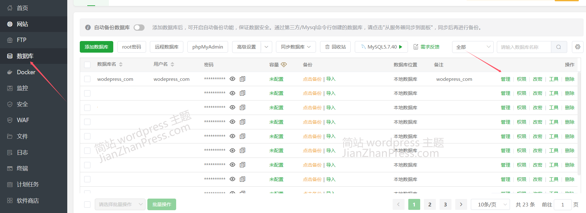 在宝塔后台找到"数据库",点击进入后,再找到自己网站对应的数据库点"管理"
