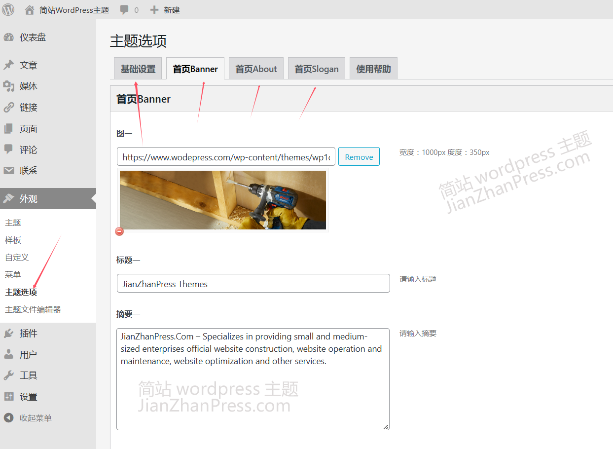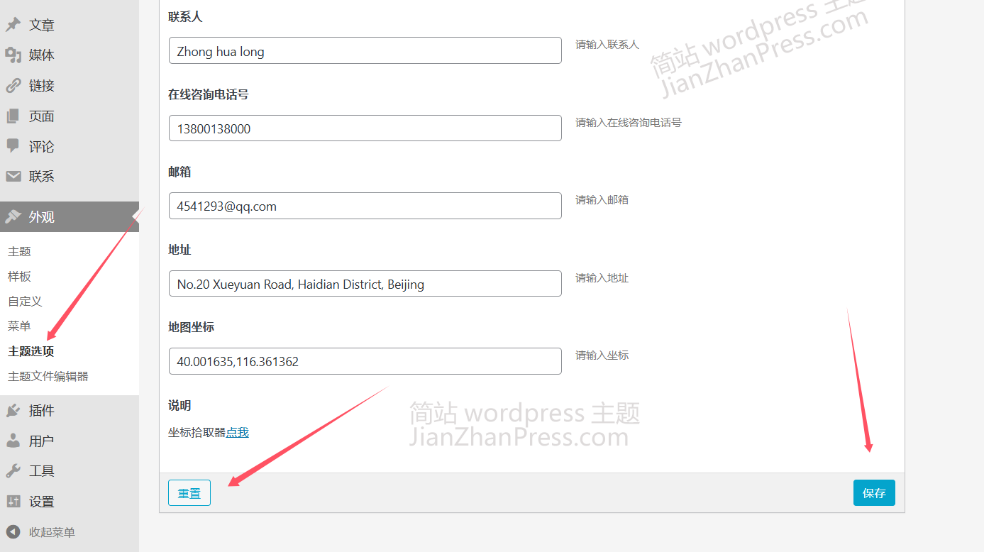 主题后台采用主题选项来管理,在"基础设置"里可以设置 logo、联系方式、地图等;首页的各模块也有相应的位置可以设置。比如,首页大图、关于我们在主题选项里有对应的位置可以设置。提示:设置完了,一定要点最下面的"保存"。