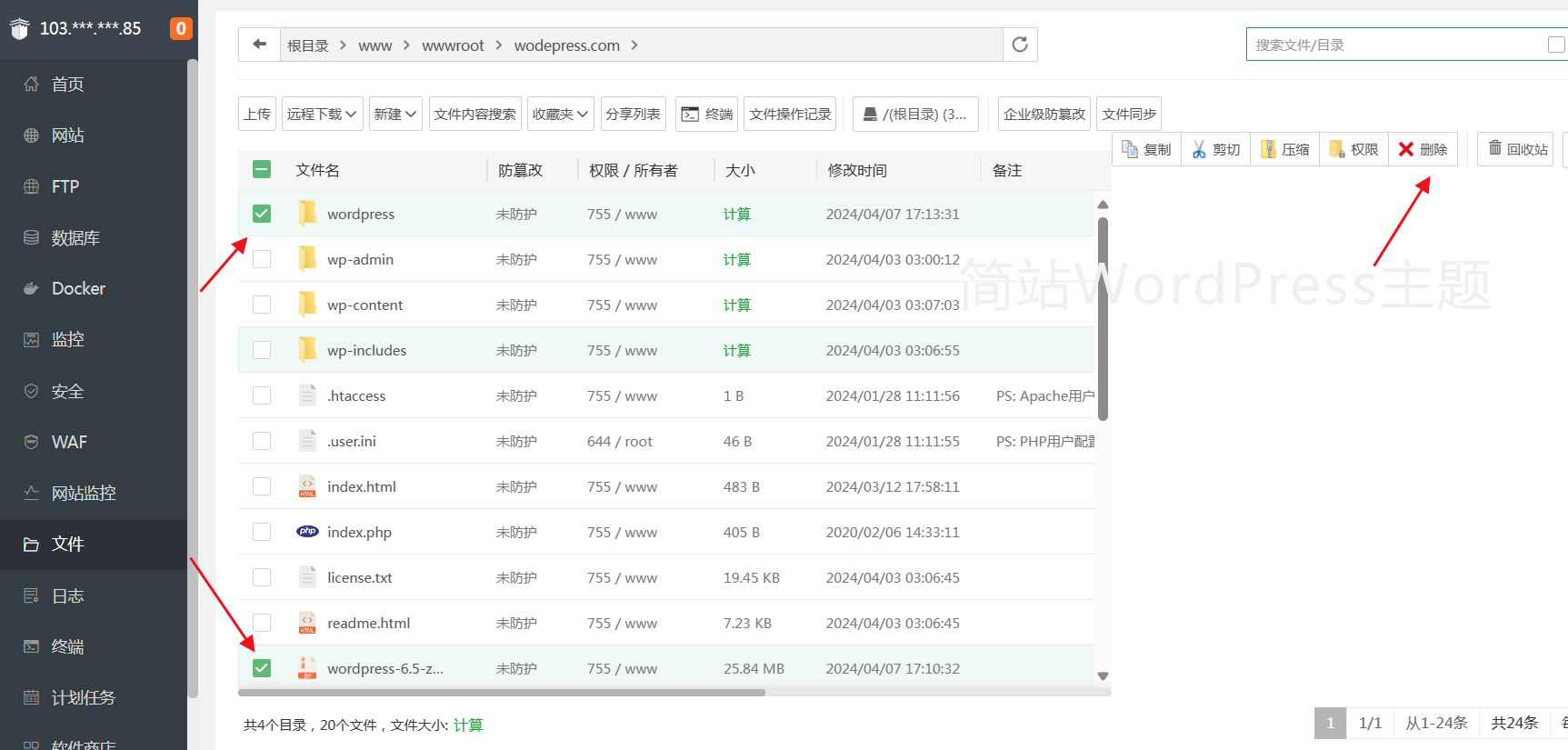 从根目录中删除 wordpress 文件夹和 WordPress 程序文件包.zip 文件