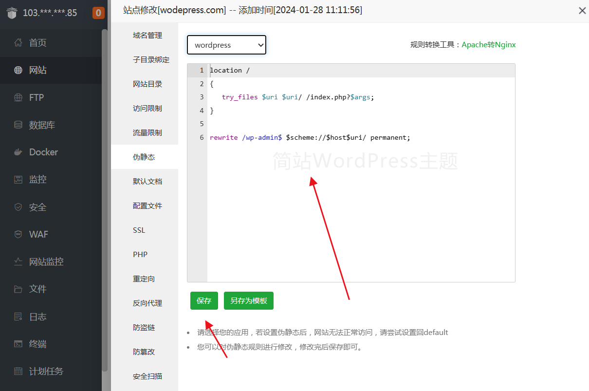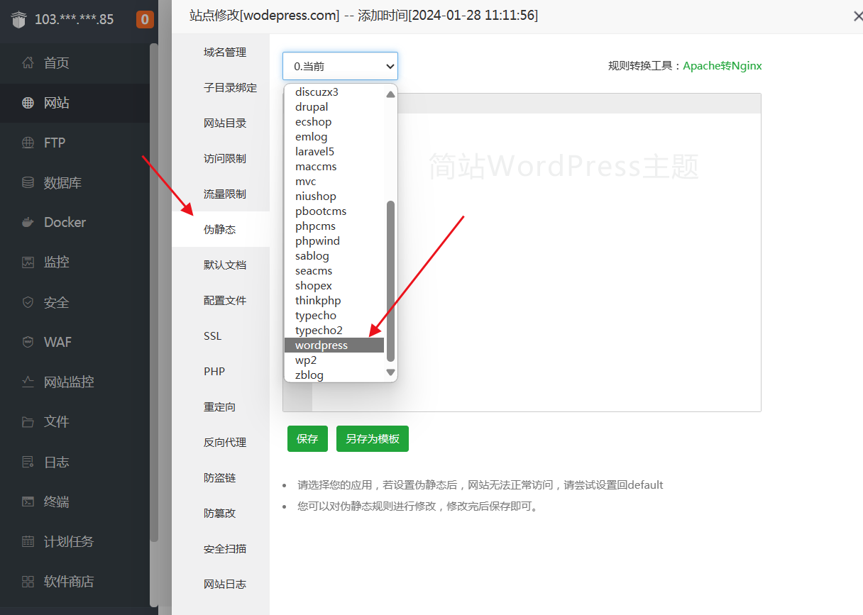 点"伪静态",在出来的选项中选择"wordpress"