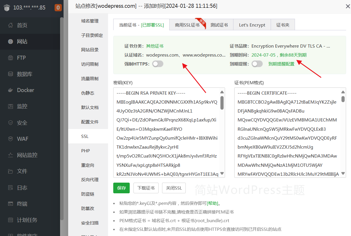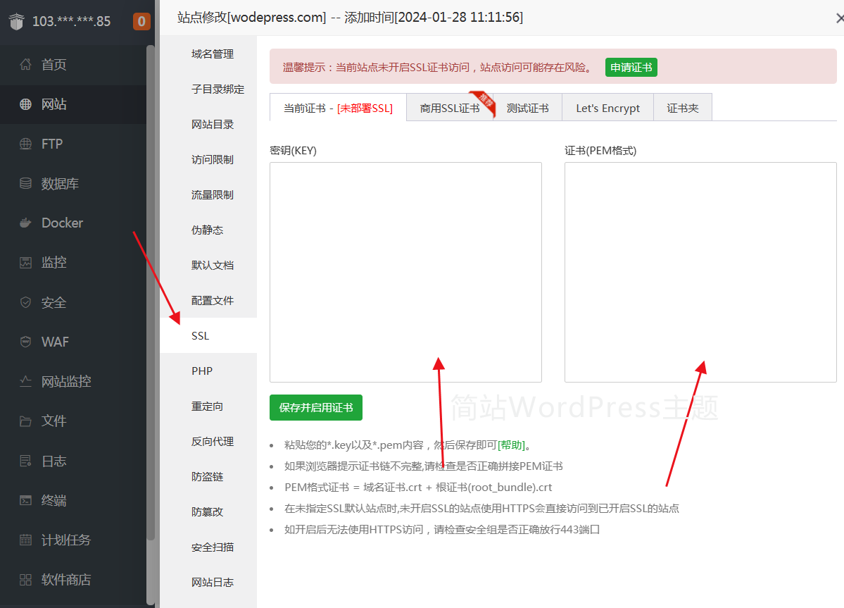 SSL 证书添加,将该域名的 SSL 证书相应的代码,复制到密钥(KEY)和证书(PEM 格式)中,"保存并启用证书"即可成功安装 SSL 证书。