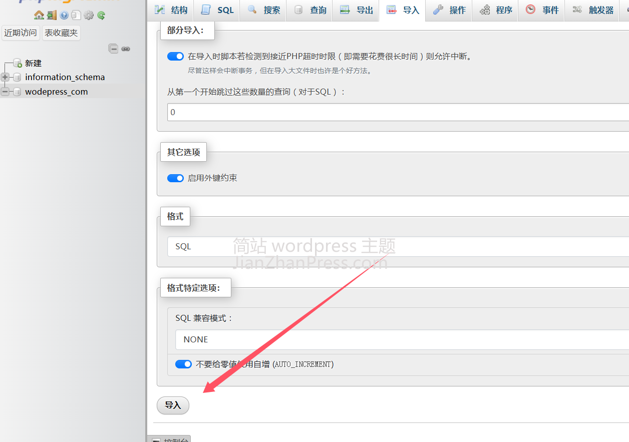 找到"导入","选择文件"将邮件中的.sql 格式的数据库文件选择后,再点击"导入"即可完成演示数据的导入。