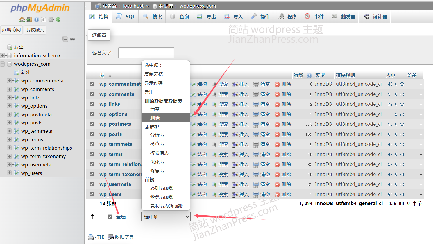 "全选"数据表,"选中项"、"删除",即可删除全部的数据表,删除完成后数据库内没有任何数据表。