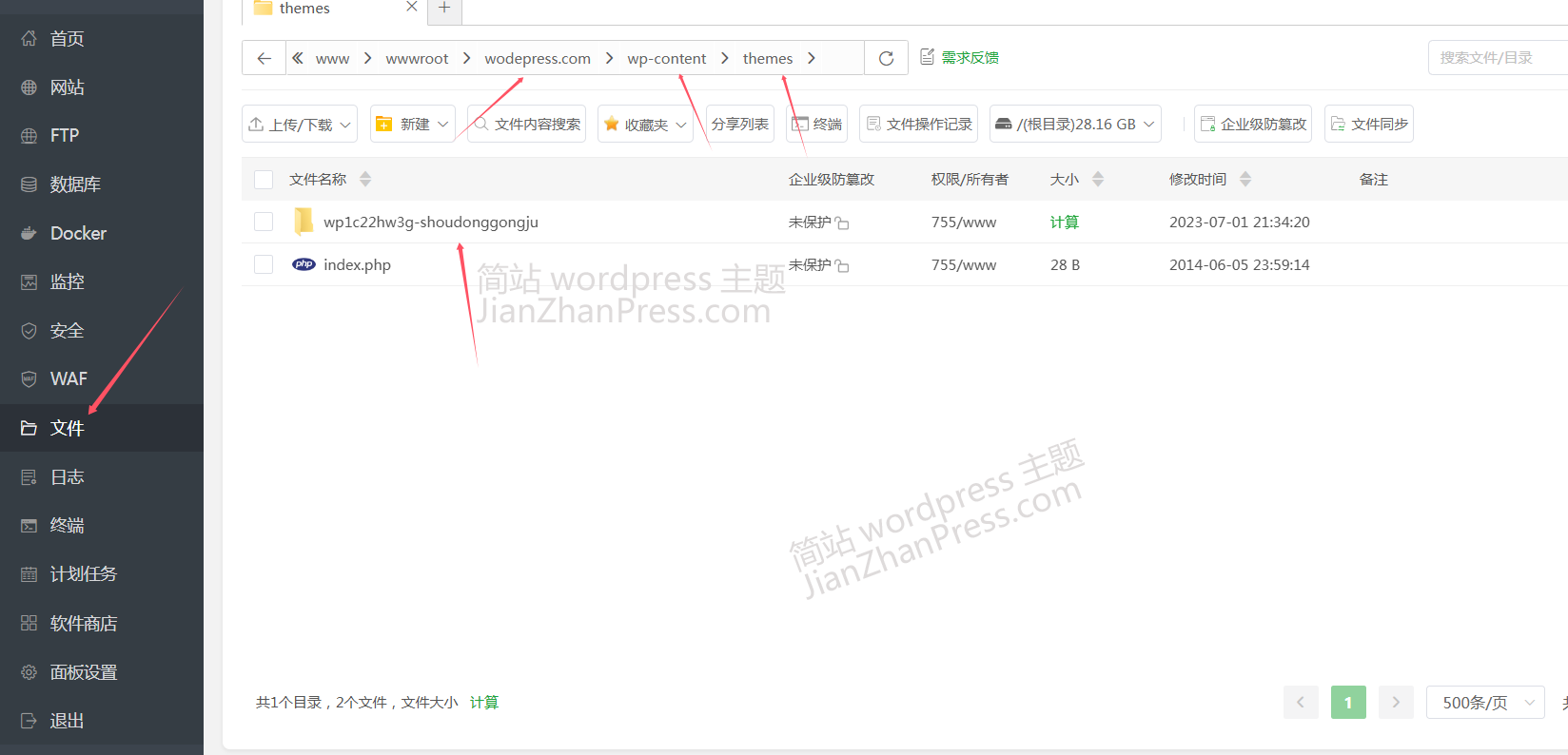 在宝塔后台找到"文件",进入到自己网站的目录 wodepress.com,再进入到 wp-content 目录,再进入 themes 目录。将邮件中的.zip 格式的主题文件上传到 themes 这个文件夹中,并解压。