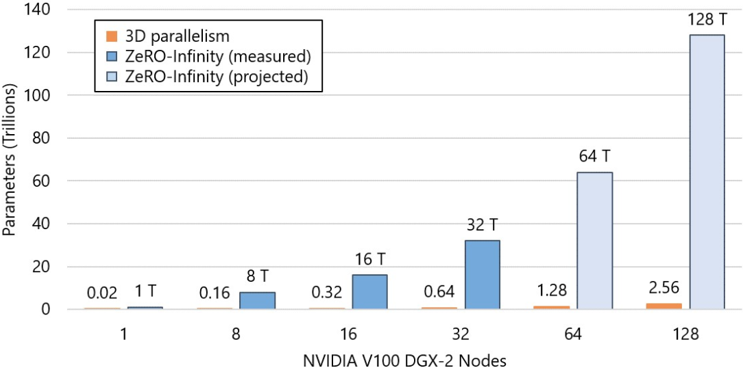 得益于这些技术,ZeRO-Infinity实现了自动化模型切分,即在模型初始化阶段(init)就自动进行切分和Offload,防止初始化时就OOM。同时,它还展现了惊人的扩展性,论文展示了在单台DGX-2节点(16张V100)上即可微调1万亿参数的模型;在512张GPU上可训练32万亿参数的模型。从设计目标来看,ZeRO-Infinity甚至将视野投向了支撑百万亿参数规模的超大模型训练。如下图所示,在相同硬件条件下(如512张V100GPU)ZeRO-Infinity能支持的模型规模(32T)比最先进的3D Parallelism(0.64T)高出50倍。