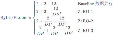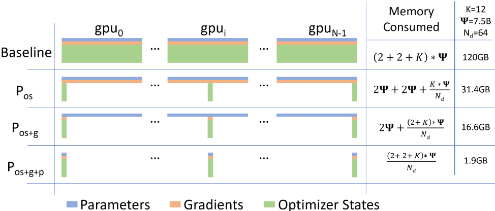 也就是说,在经典数据并行+Adam的设定下,每个可训练参数平均需要约16Bytes显存(不含激活)。这就是DeepSpeed想要"动刀"的地方。如果我们能把这16Bytes中的冗余复制部分打散分摊到多张卡上,每张卡就不需要承担完整的16Bytes开销,从而在固定总GPU数量下训练更大的模型