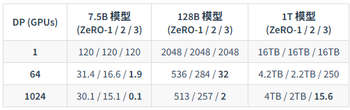 能够看到如果不使用ZeRO(相当于第一行DP=1的情况),训练一个1T参数模型需要单卡16TB显存,这在现有硬件上是不可能的。但如果开启ZeRO-3并在1024张GPU上并行(最后一行最右侧)单卡显存仅需15.6GB这意味着用现有的16GB/32GB显卡集群就可以训练万亿参数模型。