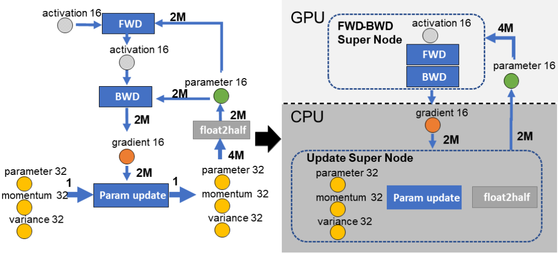 ZeRO-Offload的思路是把一部分原本需要占用CPU显存的模型状态(最典型的是FP32 master weights与优化器状态,以及在某些配置下的梯度缓冲区),卸载(Offload)到CPU内存上,由CPU负责更新;GPU侧则尽可能聚焦前向/反向的计算。论文从训练数据流与通信量角度分析了这种"GPU计算前向/反向+CPU计算参数更新 "划分在多种约束下的合理性。下图展示了其核心架构:GPU负责计算密集型的前向与反向传播(FWD-BWD Super Node)CPU负责显存密集型的参数更新(Update Super Node)。图中M表示模型参数量,对应箭头上的2M/4M可理解为一次step内在CPU与GPU之间需要交换的数据量级(常见的拆解是:梯度约2M(FP16)参数回传约2M(FP16)合计约4M;而FP32 master与优化器状态主要驻留在CPU内存中)