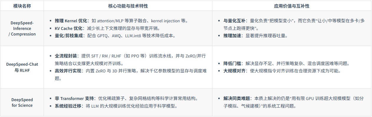 **DeepSpeed Inference/Compression:**针对推理和压缩(量化、剪枝、KV Cache优化等)的加速库;