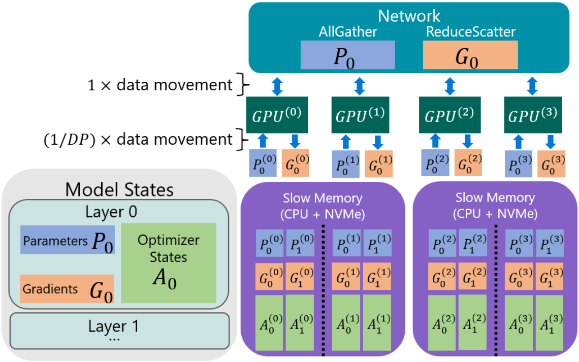 下图展示了带宽为中心的分区策略,模型状态被切分并存放在慢速存储(CPU+NVMe)中。与传统的让单个GPU负责所有数据传输不同,ZeRO-Infinity让每张GPU(