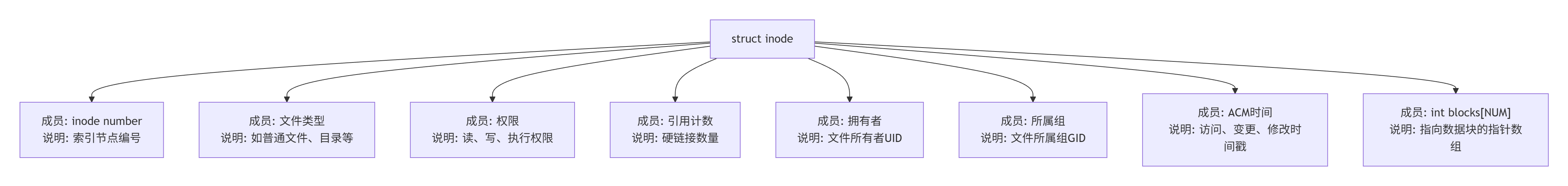 #define NUM 15:这是一个宏定义,表明后续的 blocks数组大小为 15。这里的数字 15 是一个简化的例子。在实际的经典文件系统(如 ext2)设计中,inode 中用于存储数据块指针的数组通常有 12 个直接指针、1 个一级间接指针、1 个二级间接指针和 1 个三级间接指针,总共 15 个"槽位"。这能支持从几 KB 到 TB 级别的文件大小。