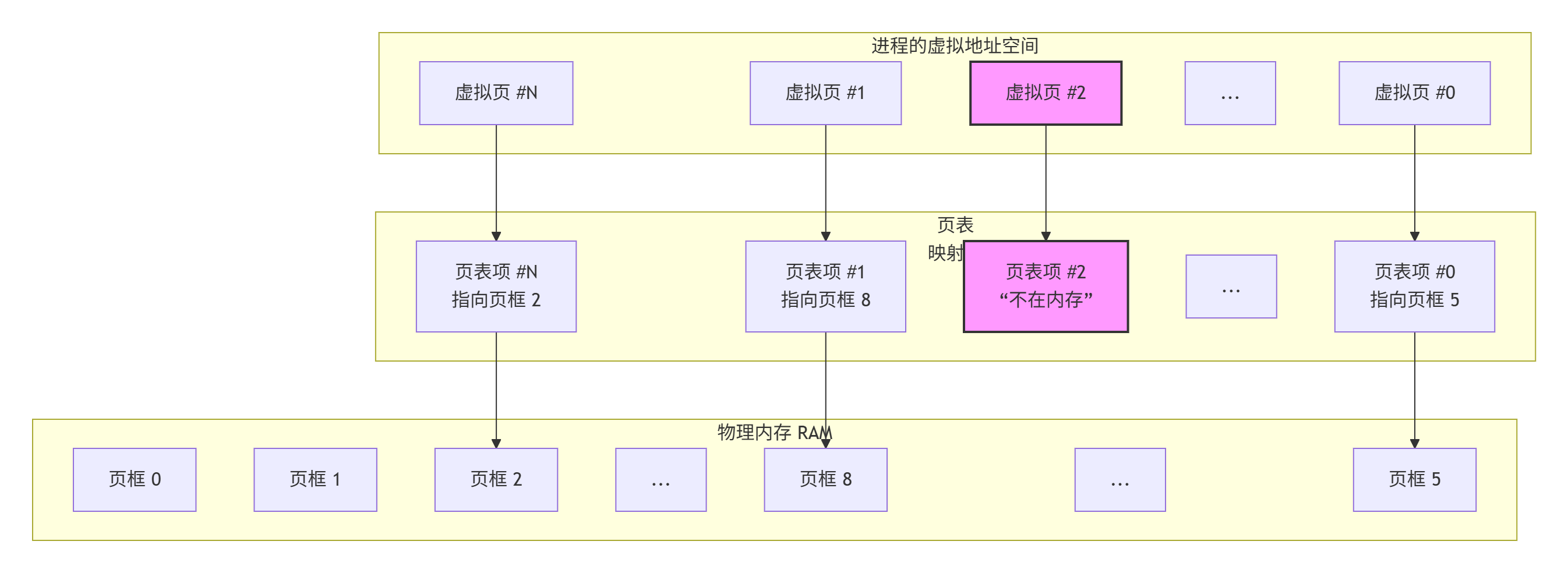 缺页异常:如果页表项中的"存在位"为 0(如图中的虚拟页 #2),表示该页不在物理内存中。这会触发一个缺页异常。