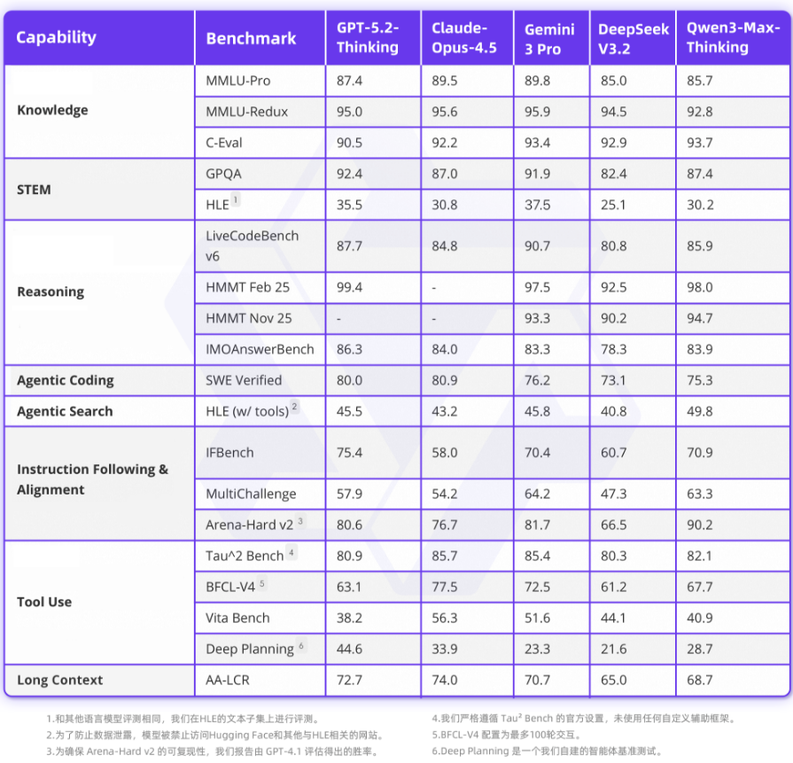 | 测试项 | Qwen3-Max-Thinking | GPT-5.2-Thinking | DeepSeek V3.2 |
