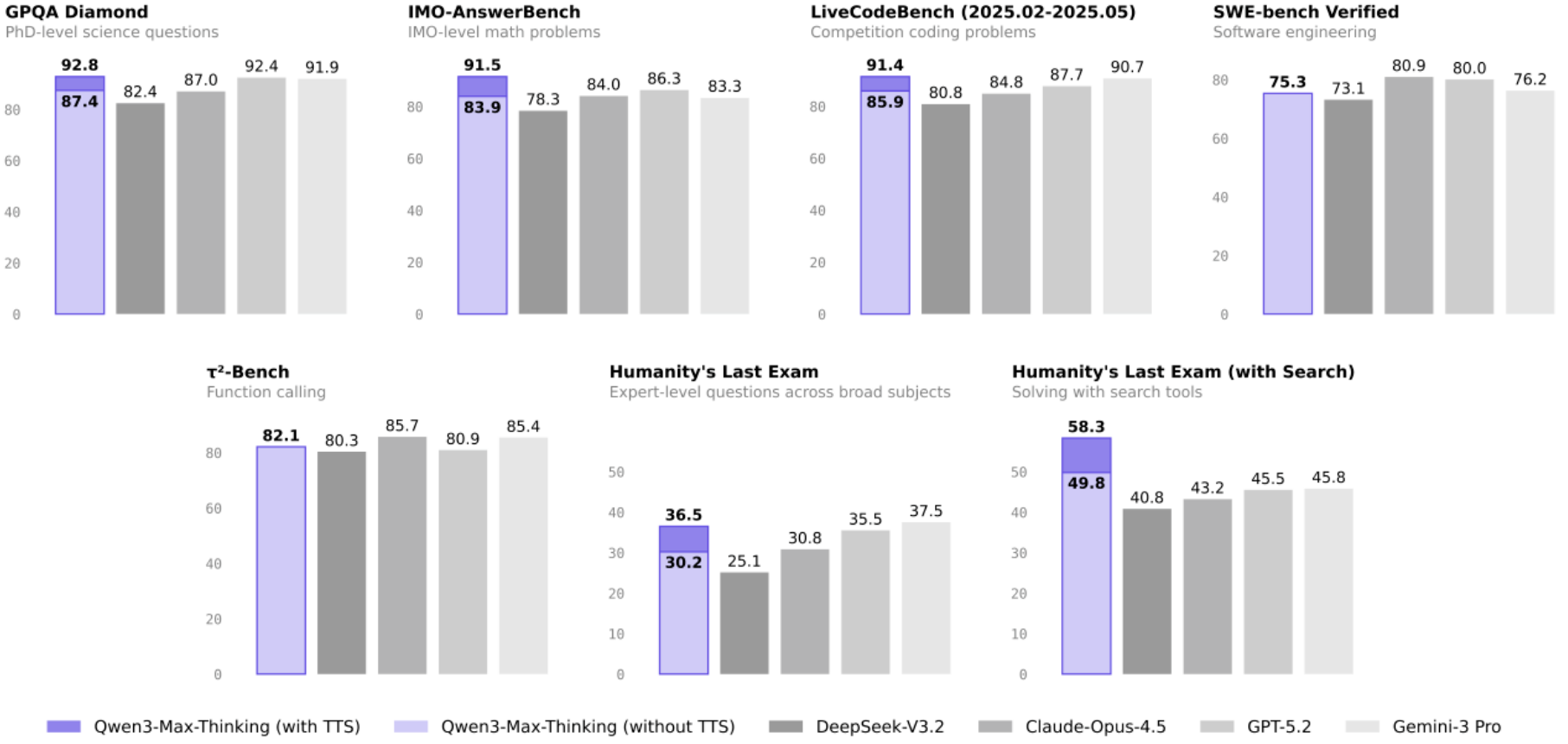 | 测试项 | Qwen3-Max-Thinking | GPT-5.2-Thinking | Claude Opus 4.5 |