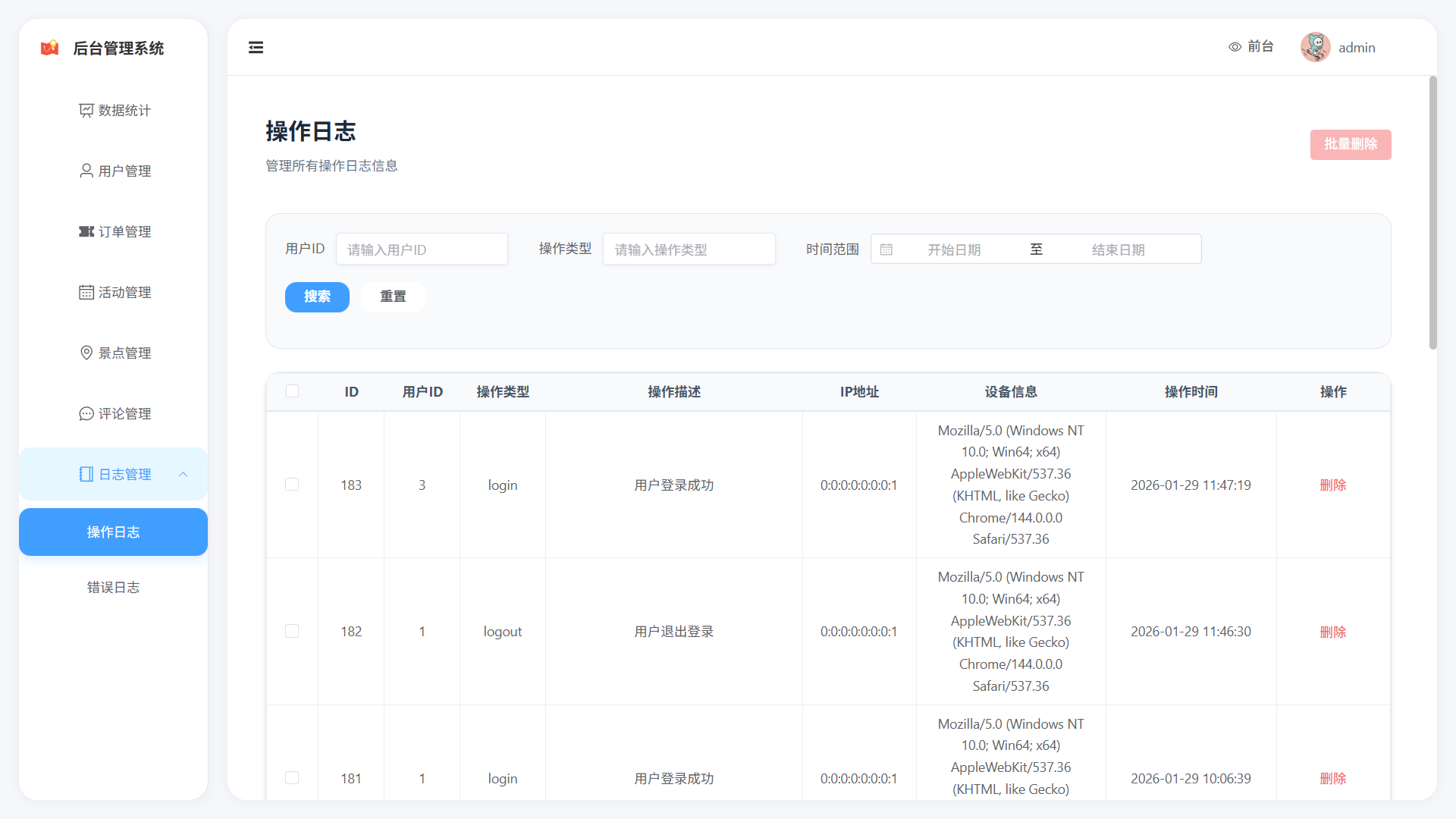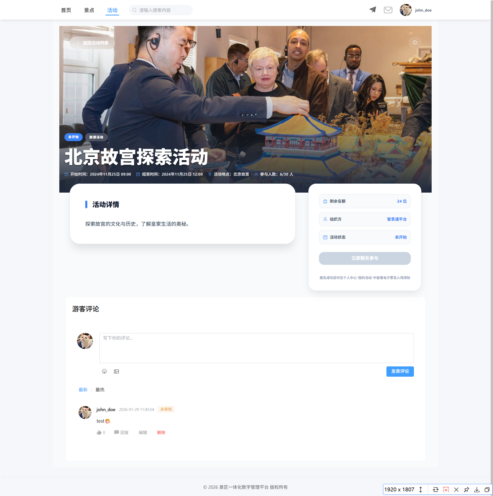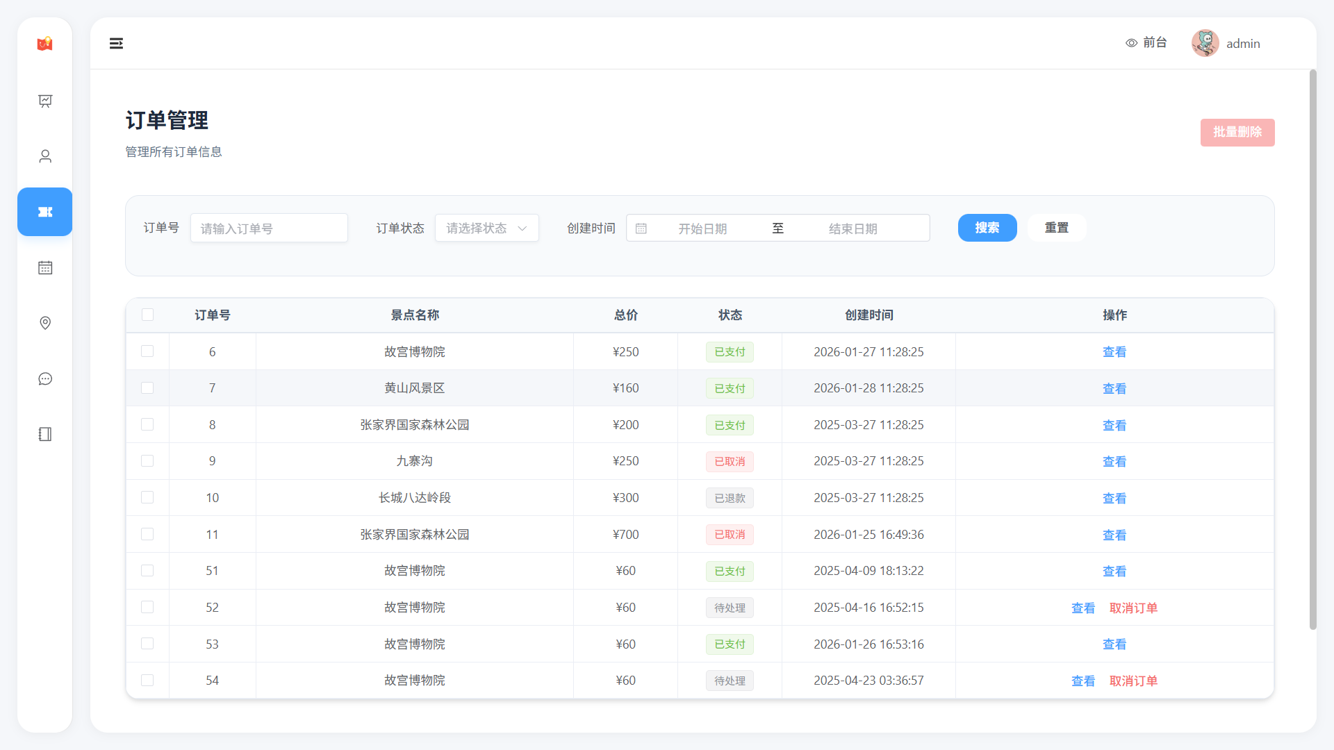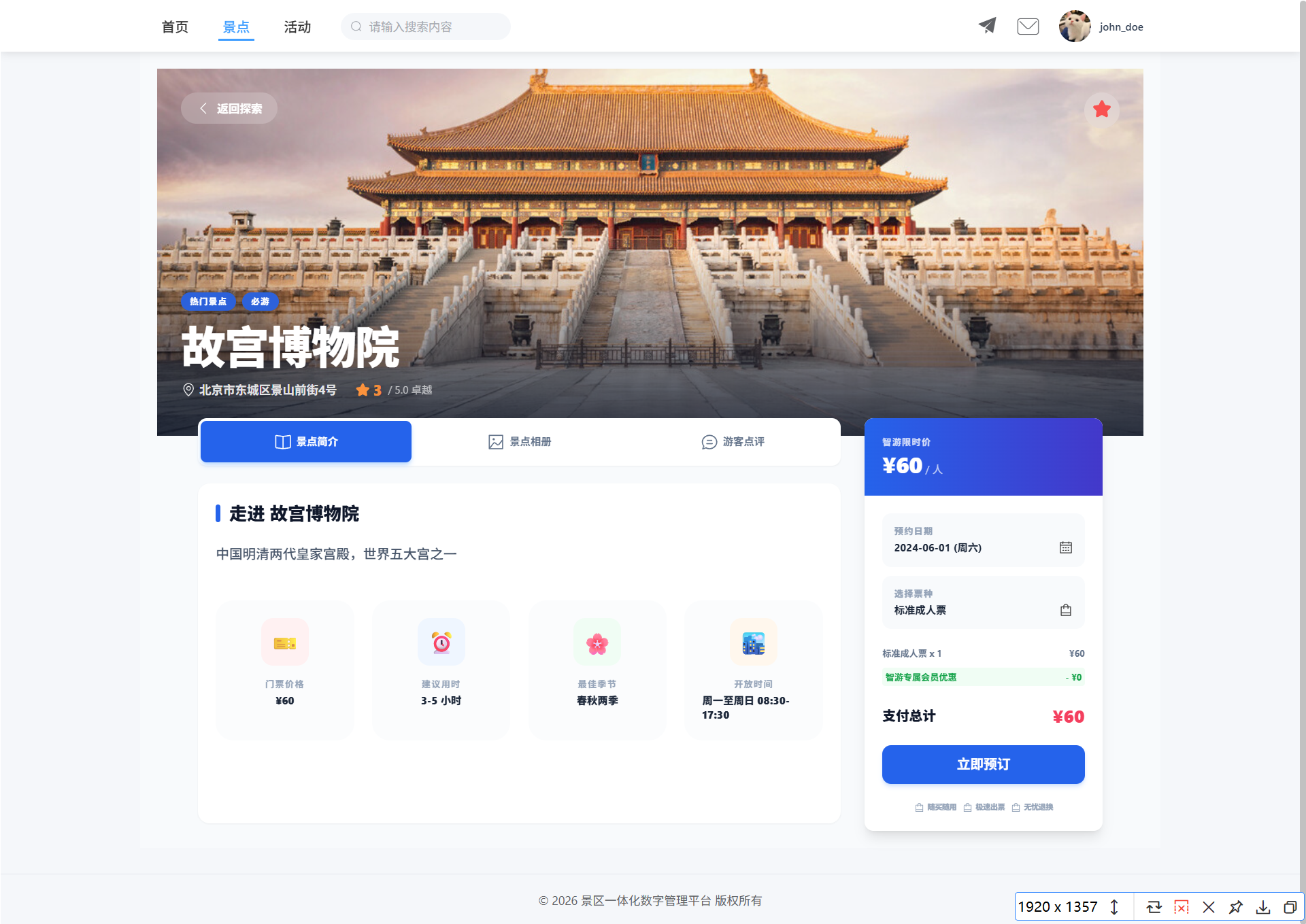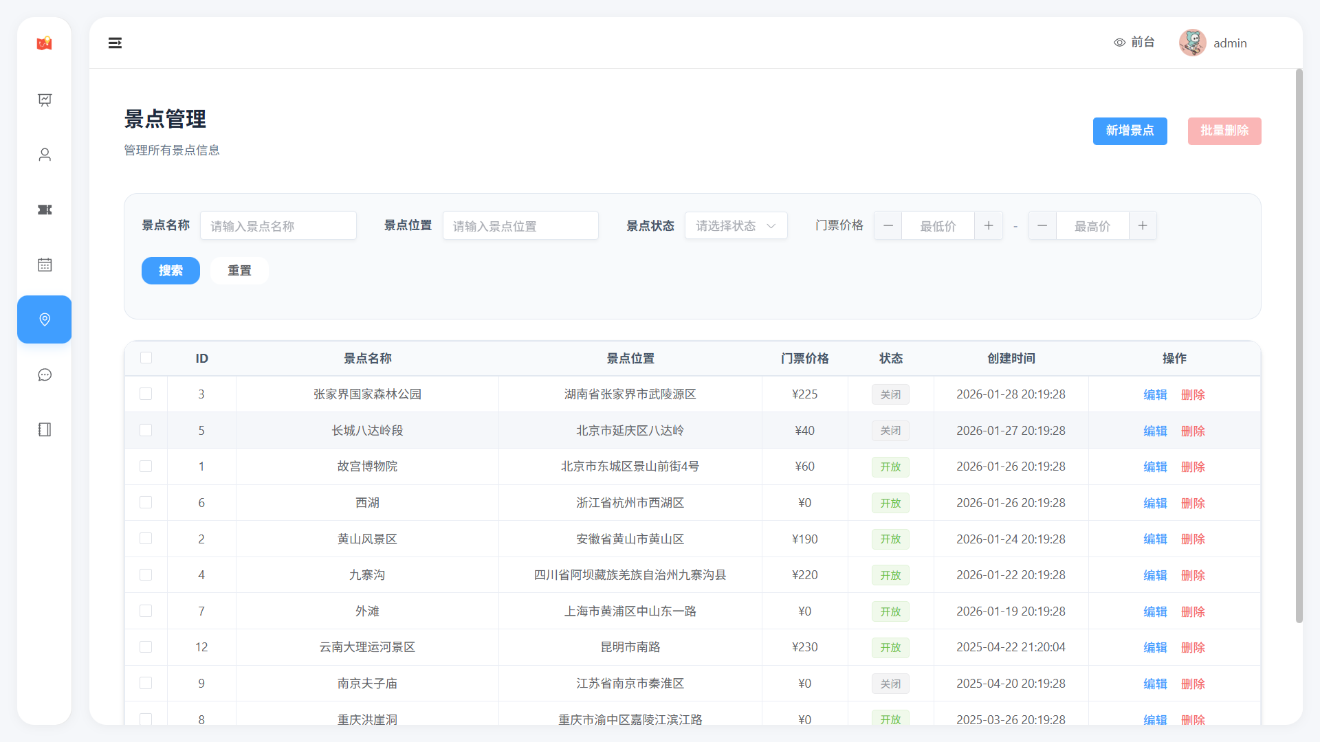 - 景区信息展示(名称、描述、位置、价格、状态)