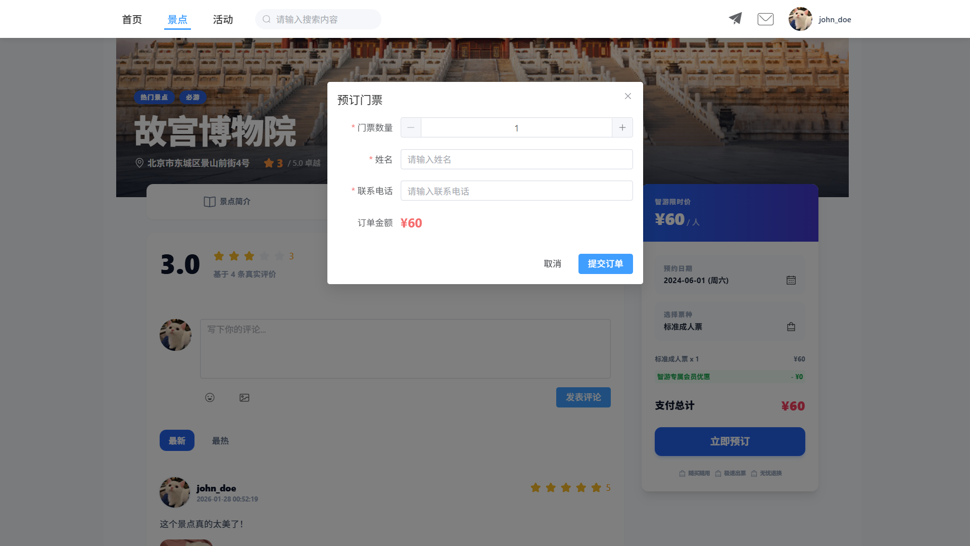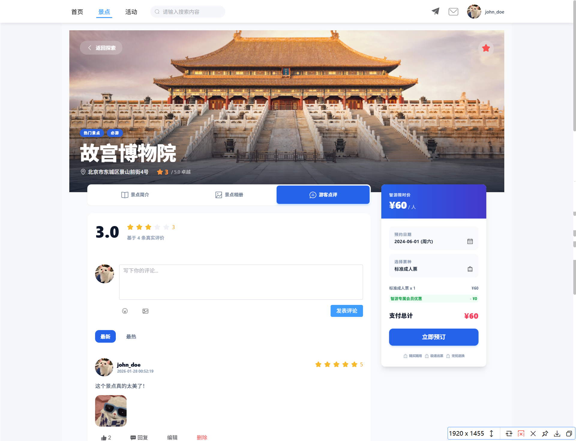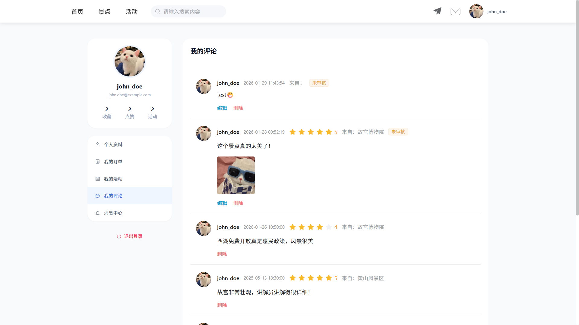 - 评论组件: 集成在景点详情页面中