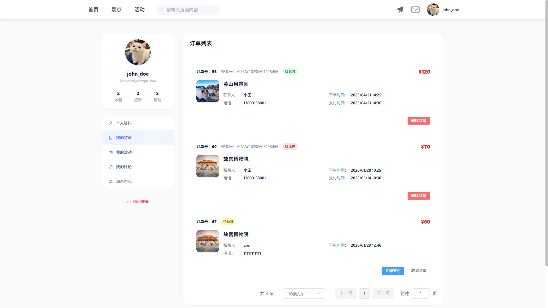 - 订单明细管理(景点信息、数量、单价、总价)