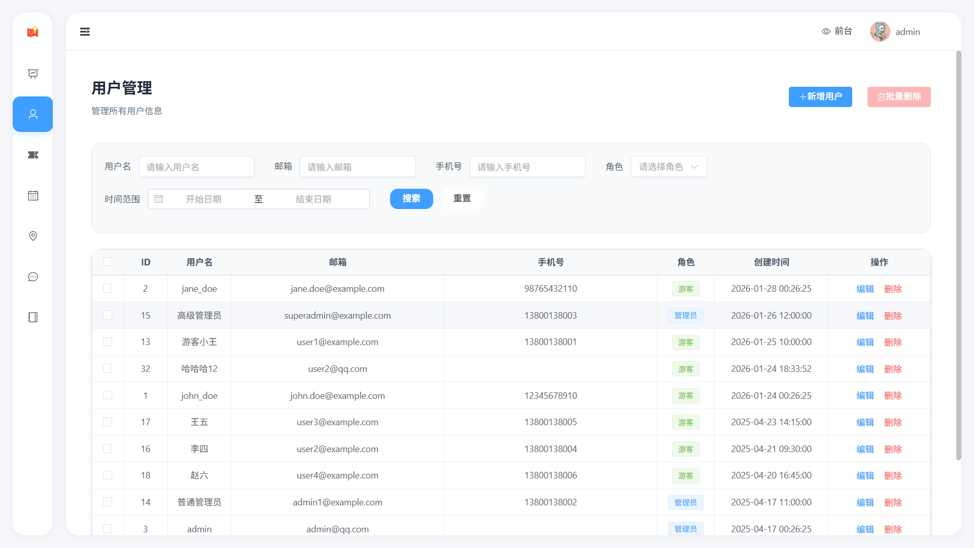 - 用户统计(总数、今日新增、管理员数量)