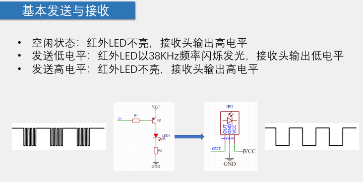 红外信号会调制在 38kHz 载波上(抗干扰),接收头会自动解调,输出 "去载波" 后的高低电平信号,单片机只需解析电平的时间长短即可。