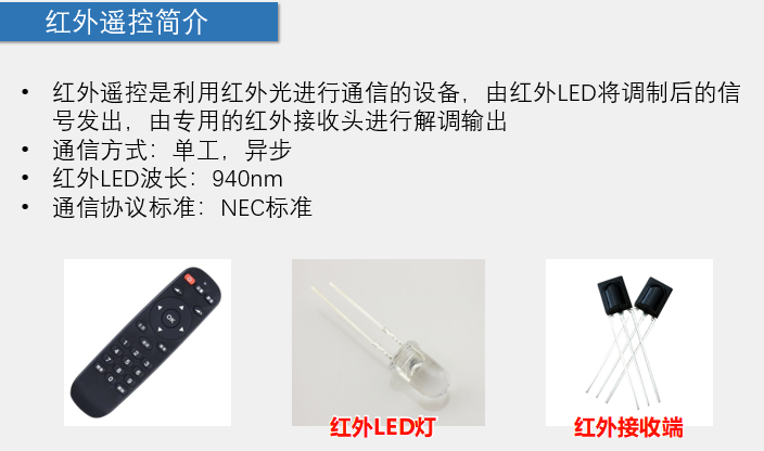 红外遥控是一种以 红外线(波长约 940nm,不可见光) 为传输介质的短距离无线通信方式,核心由两部分组成: