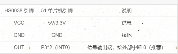 红外接收头(HS0038)接线极简单,仅需 3 根线,推荐接外部中断引脚(避免轮询占用 CPU):