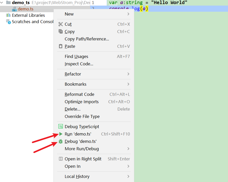 右键demo.ts文件,点击Run 'demo.ts'或者"Debug 'demo.ts'