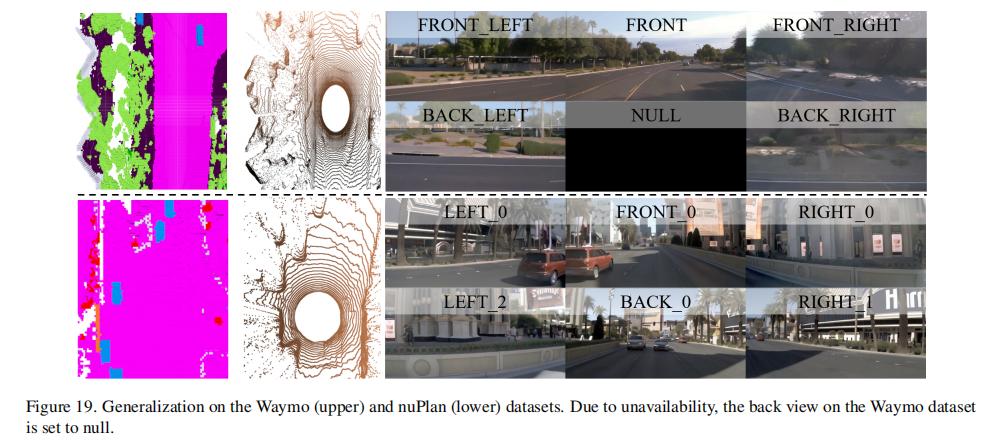 UniScene 能够直接迁移到 Waymo 和 nuPlan 数据集,在给定场景布局和条件参考图像的情况下,生成高质量数据(图 19)。