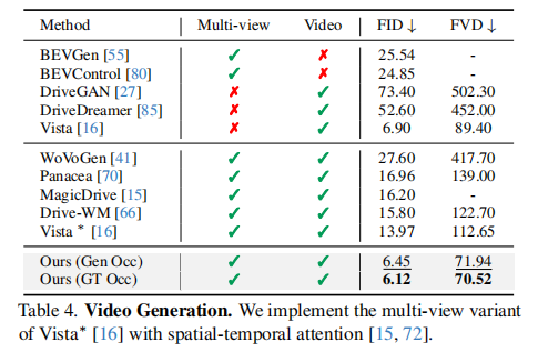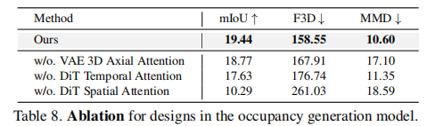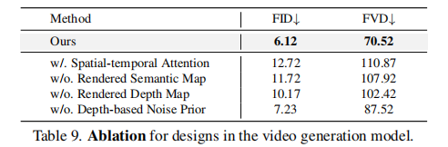 - 占用率基于语义和深度图:相比时空注意力,FVD 降低 34.95%,显著提升跨视角一致性;