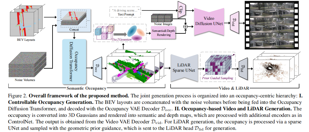 UniScene 的核心思想是通过分层生成策略,先从 BEV 布局生成语义占用率作为中间表示,再基于该中间表示分别生成视频和激光雷达数据。框架整体分为三个关键模块:可控语义占用率生成、基于占用率的视频生成和基于占用率的激光雷达生成。