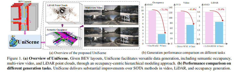 图 1(a)展示了 UniScene 的整体流程:给定 BEV 布局,通过占用率中心的分层建模方法,实现语义占用率、多视角视频和激光雷达点云的多任务生成;图 1(b)显示,在视频、激光雷达和占用率生成任务中,UniScene 相比现有 SOTA 方法均实现了显著性能提升。