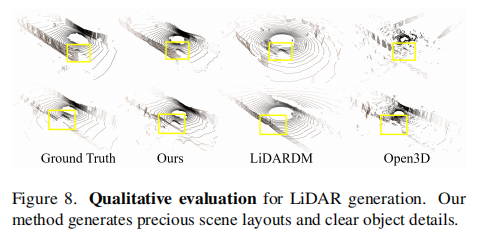 图 8 显示,UniScene 生成的激光雷达点云在场景布局准确性和物体细节清晰度上显著优于对比方法。