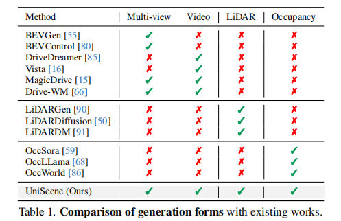 - 视频生成:BEVGen、MagicDrive 等仅支持单模态或单视角生成,Vista 缺乏多视角一致性。UniScene 基于占用率的多视角条件指导,实现高质量多视角视频生成;