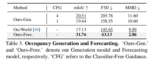 - 占用率生成:mIoU(平均交并比)、F3D(3D Fréchet 距离)、MMD(最大均值差异);