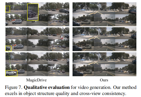 图 7 显示,与 MagicDrive 相比,UniScene 生成的视频在物体结构质量和跨视角一致性上均有明显提升。