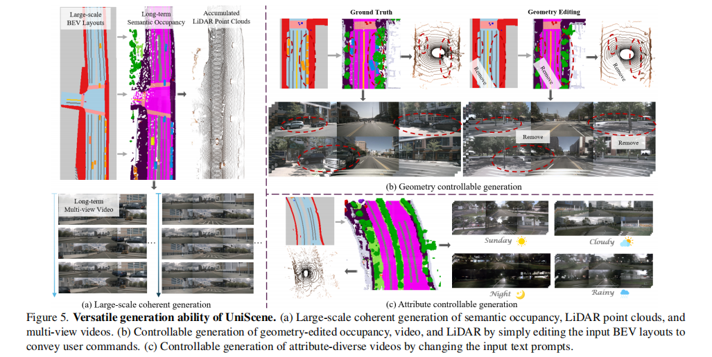 - 大规模连贯生成:生成长时间序列的语义占用率、激光雷达点云和多视角视频,保持时空一致性(图 5(a));