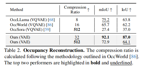 - 占用率重建:表 2 对比了 UniScene 的 VAE 与现有 VQVAE 方法的重建性能。在 512 的高压缩比下,UniScene 的 mIoU 达到 72.9%,超过 OccWorld 10.96%,验证了连续压缩方式的优越性。