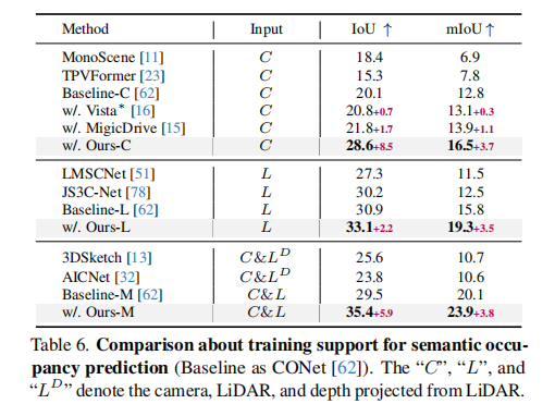 语义占用率预测:表 6 显示,在相机、激光雷达及多模态输入下,使用 UniScene 生成的数据进行增强后,模型的 IoU 和 mIoU 均显著提升,其中相机输入下 IoU 提升 8.5%;