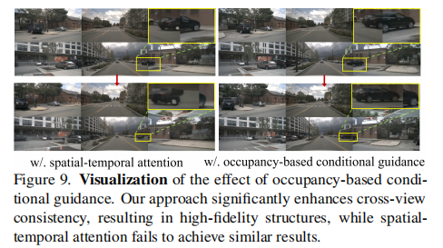 图 9 显示,占用率基于条件指导相比时空注意力,能显著提升跨视角一致性和结构保真度。