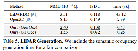 - 激光雷达生成:MMD、JSD(Jensen-Shannon 散度)、推理时间;