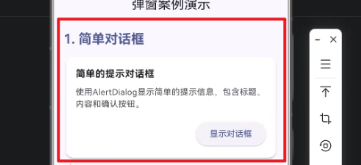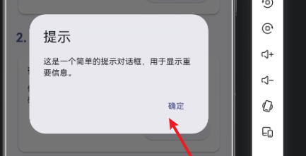 '使用AlertDialog显示简单的提示信息,包含标题、内容和确认按钮。',