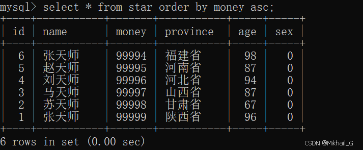 select * from star order by money asc;