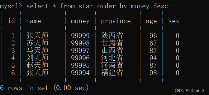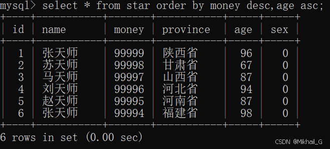 标注:查询star表中所有数据,按照money字段降序排列,若money一样,按age字段升序排列