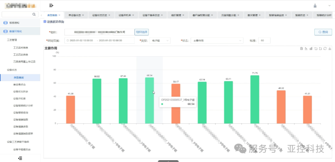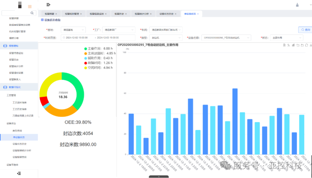 数据可视化模块:实时展示工艺参数、设备状态占比,精准计算设备综合效率(OEE)与开机率,以多指标对设备健康状态打分对比,高亮异常设备,助力重点管控与流程改善。