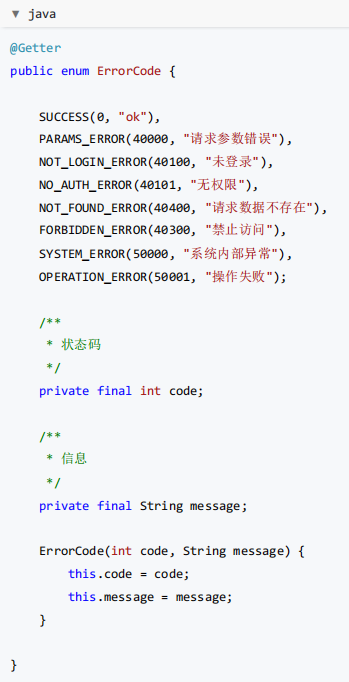 设计自定义错误码枚举并与 HTTP 语义对齐(例如 40100 表示未登录),便于跨团队沟通。