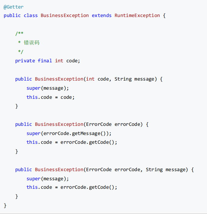 使用专门的业务异常类(BusinessException)而非直接抛 RuntimeException,清晰分层。