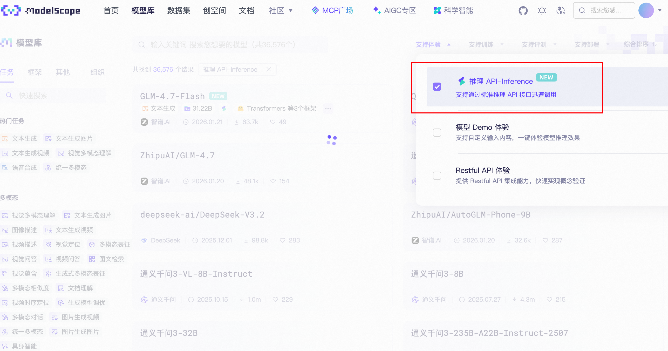 我们可以使用魔搭社区的免费模型,每天有2000的免费调用额度。