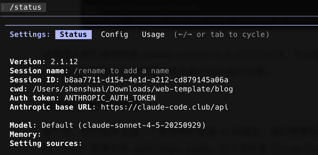 保存并关闭 settings.json 文件。我们重新运行 Claude Code 并通过 /status 命令查看当前模型信息: