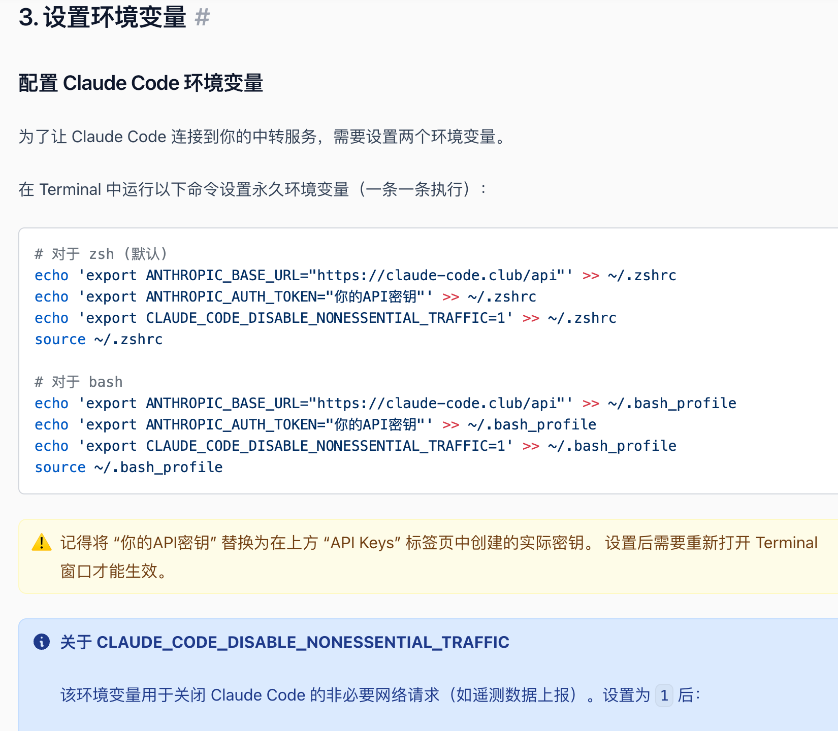 然后就可以通过环境变量配置 Claude Code 访问智谱大模型 API 的连接地址和身份令牌了。你可以在你的 Shell 配置文件中添加下面两行